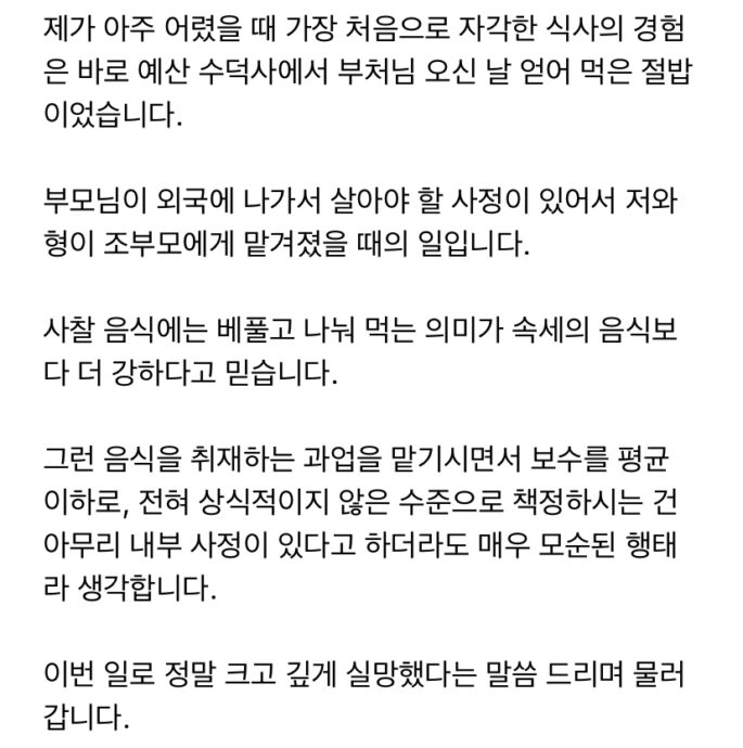 일을 하나 의뢰받았다. 북토크에서 인사를 나눈 적 있는 독자로부터 언질을 받고 담당자가 연락을 해 왔다. 사찰을 취재한 뒤 일정량의 원고를 쓰는 일이었다.